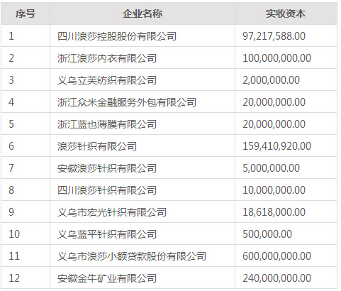 浪莎控股集团有限公司由自然人翁荣金、翁关荣、翁荣弟共同投资组建的有限责任公司,公司成立于1995年6月22日。公司地址位于浙江省义乌市经发大道308号,法定代表人:翁荣金。经义乌市工商行政管理局核准登记注册公司注册资本:人民币60,000.00万元,公司经营范围:实业投资、投资管理咨询(不含证券、期货等金融业务);袜子、内衣、纱线的批发、零售;电子元器件的生产、销售。(依法须经批准的项目,经相关部门批准后方可开展经营活动。)