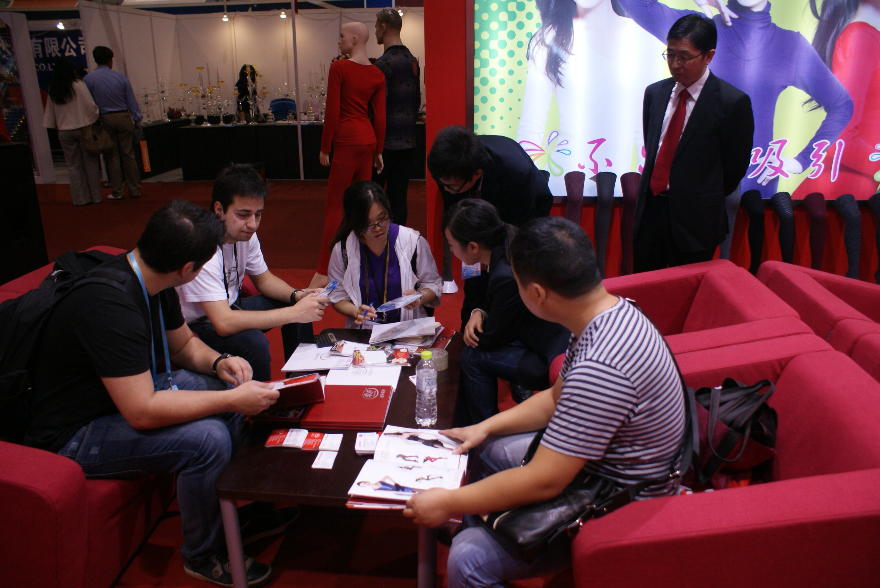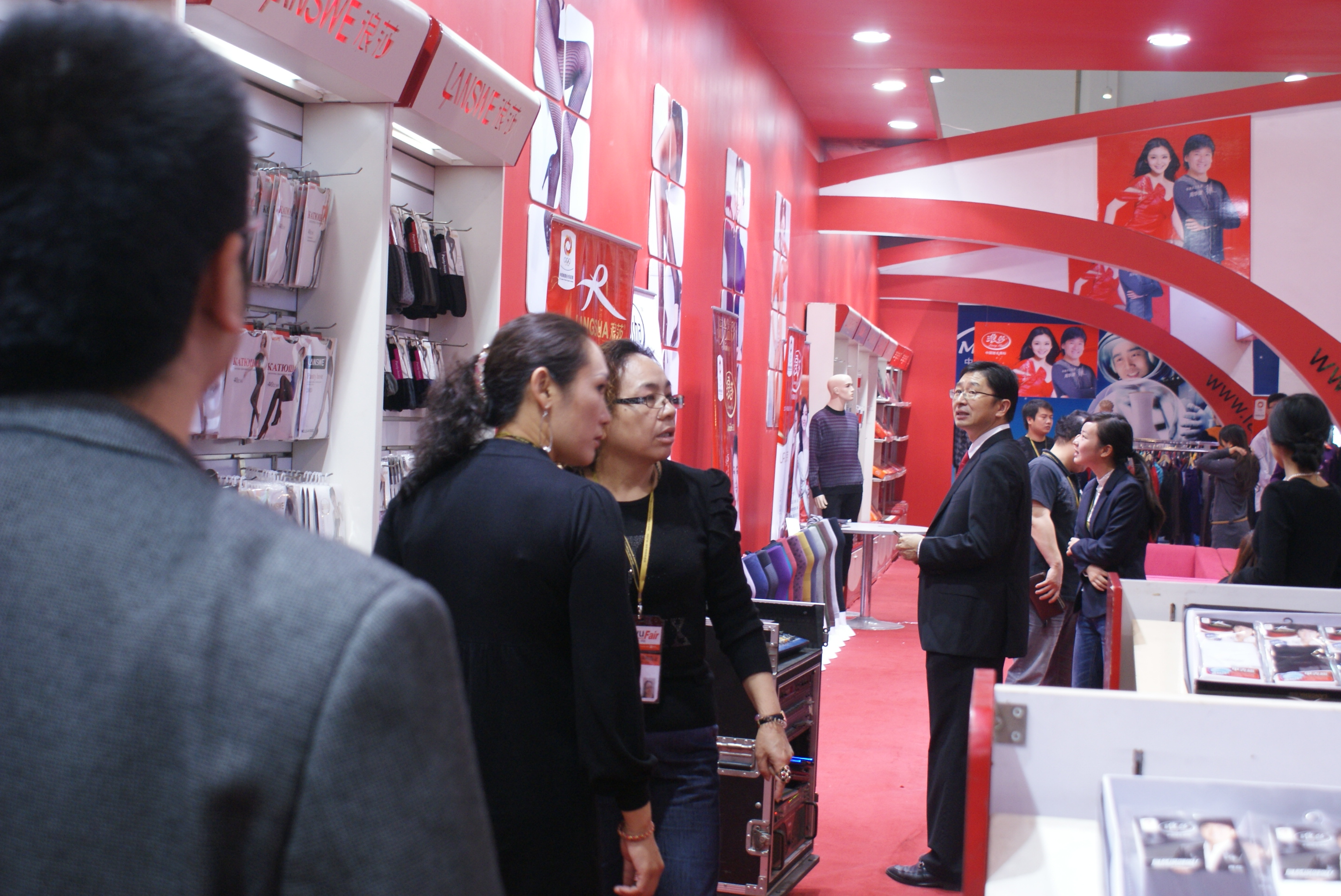 与往年一样,浪莎集团的展位被安排在A2馆主通道的右侧,占据有利位置。不同的是,浪莎每年的展馆设计都有不同,继去年的黑色钢筋骨架,配合大红灯笼的中国风设计之后,今年则以红白相衬的流线型设计为主,以红色经典演绎时尚概念。