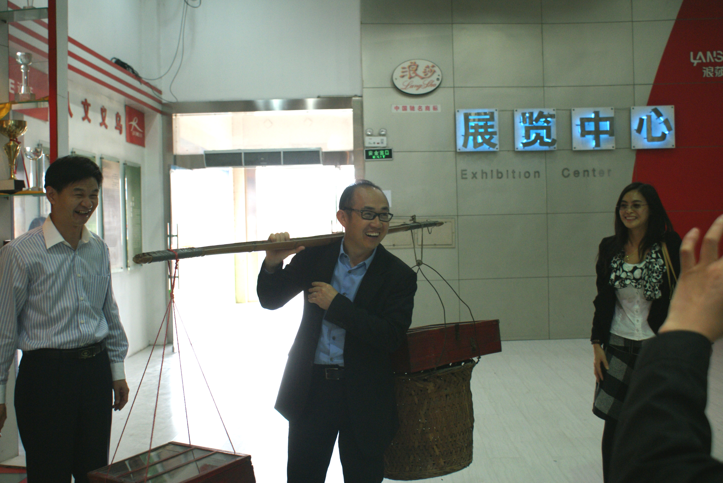 下午15点20分,潘董一行10余位企业家及工作人员来到浪莎二期。在浪莎展览厅,潘董对其中陈列的一副货郎担很感兴趣,于是饶有兴味地试着把它挑起来。或许是比较陌生的缘故,货郎担不听使唤,不过潘董倒不打算放弃。在试了几次后,潘董找到了平衡点,把货郎担挑了起来。此刻,在场的工作人员都快乐地笑了起来。