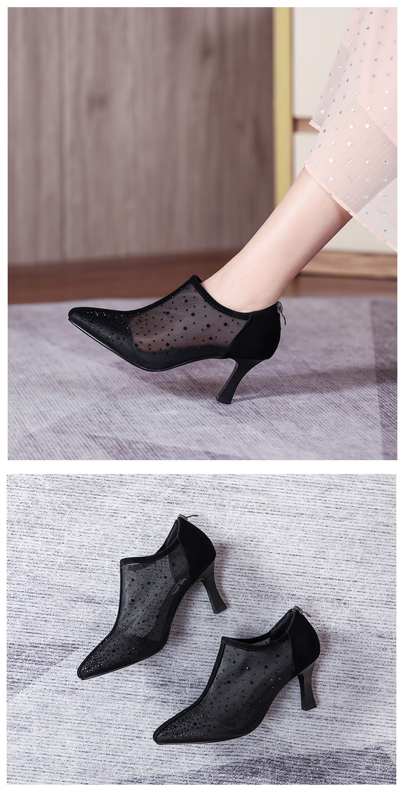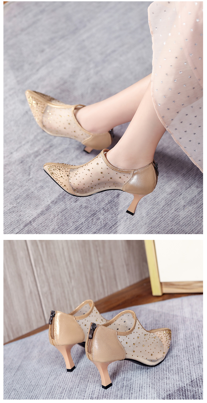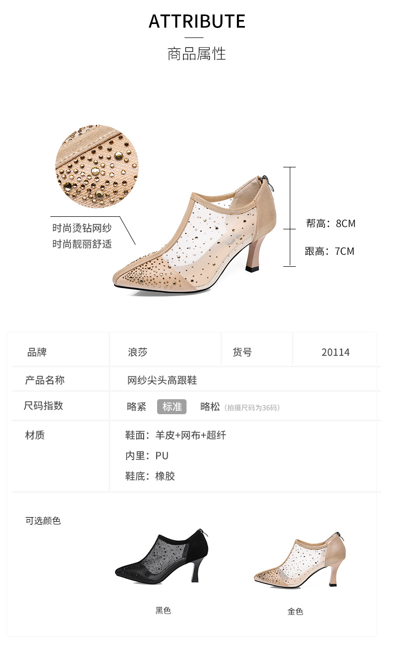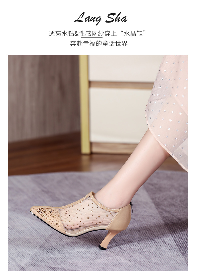 浪莎法式尖头高跟鞋女细跟2021春夏新款深口镂空网纱水钻休闲单鞋