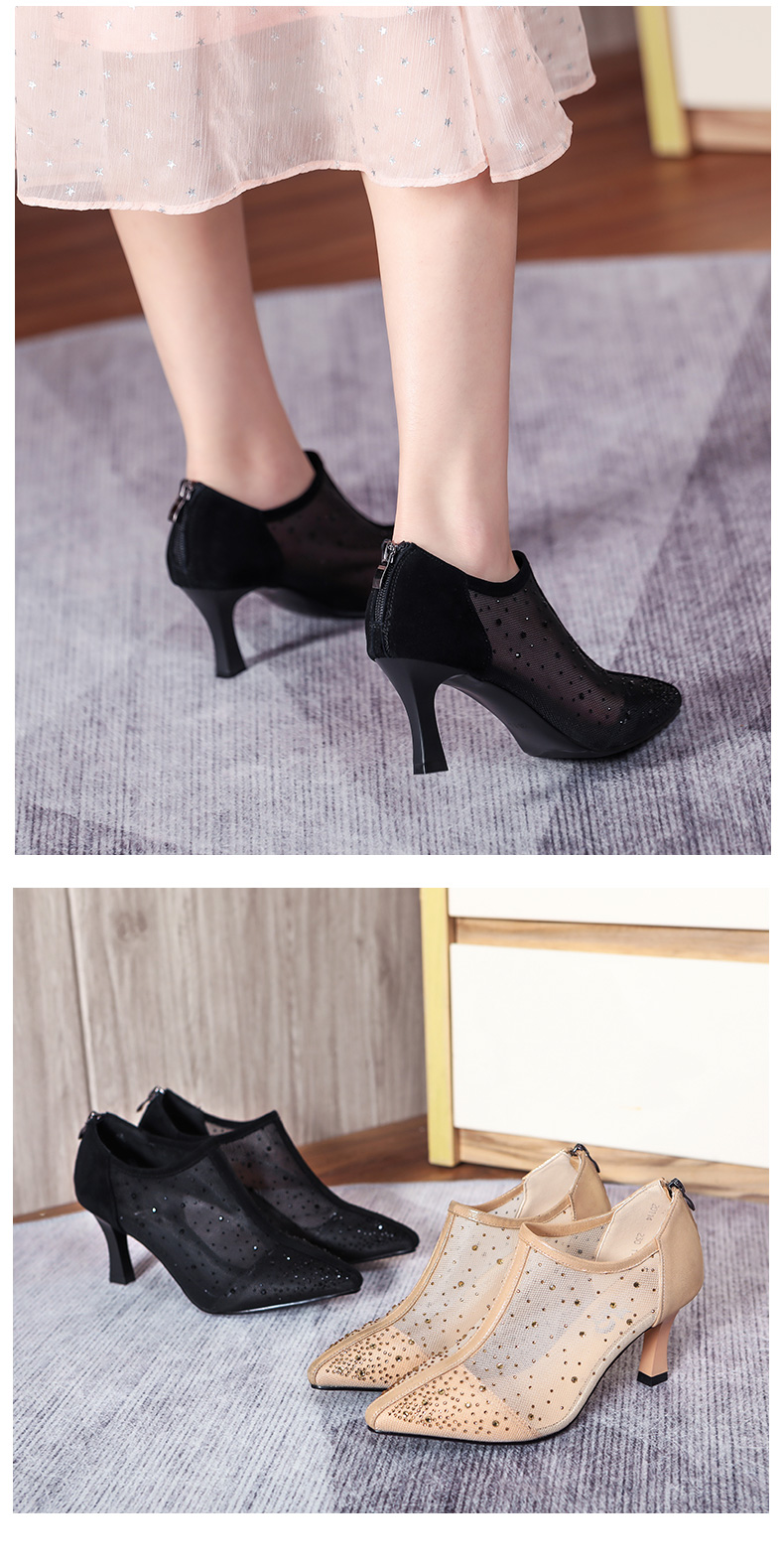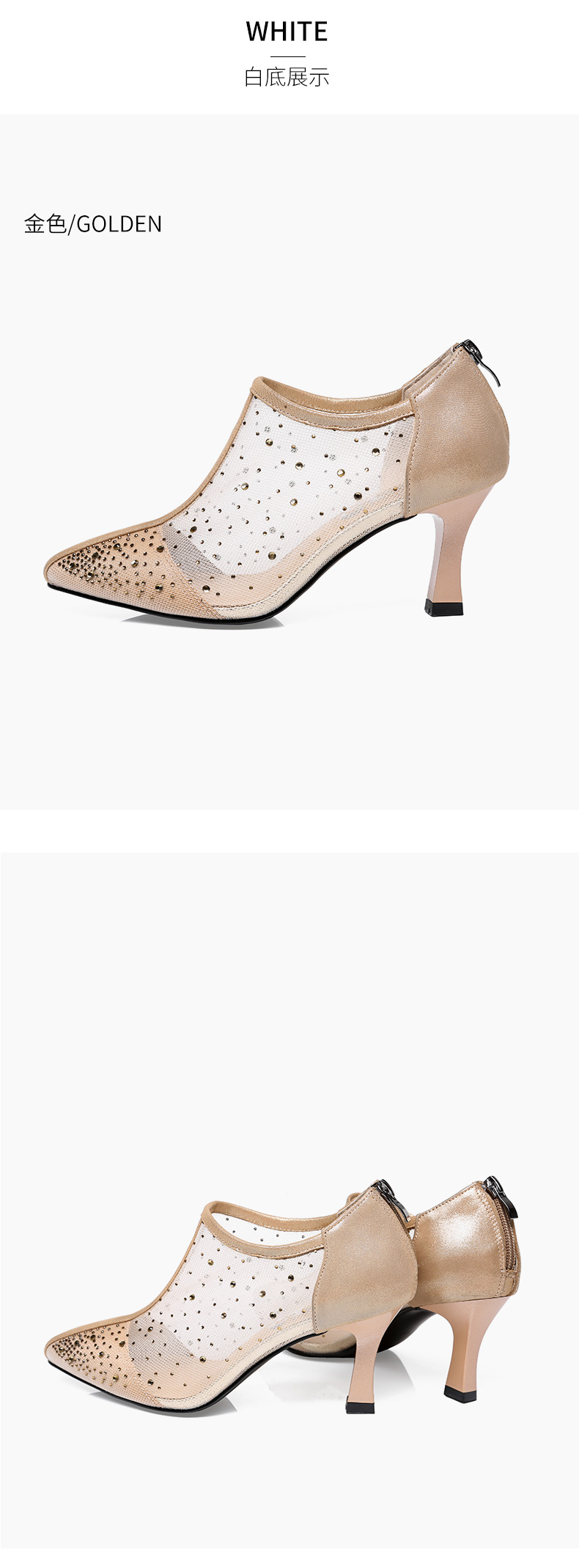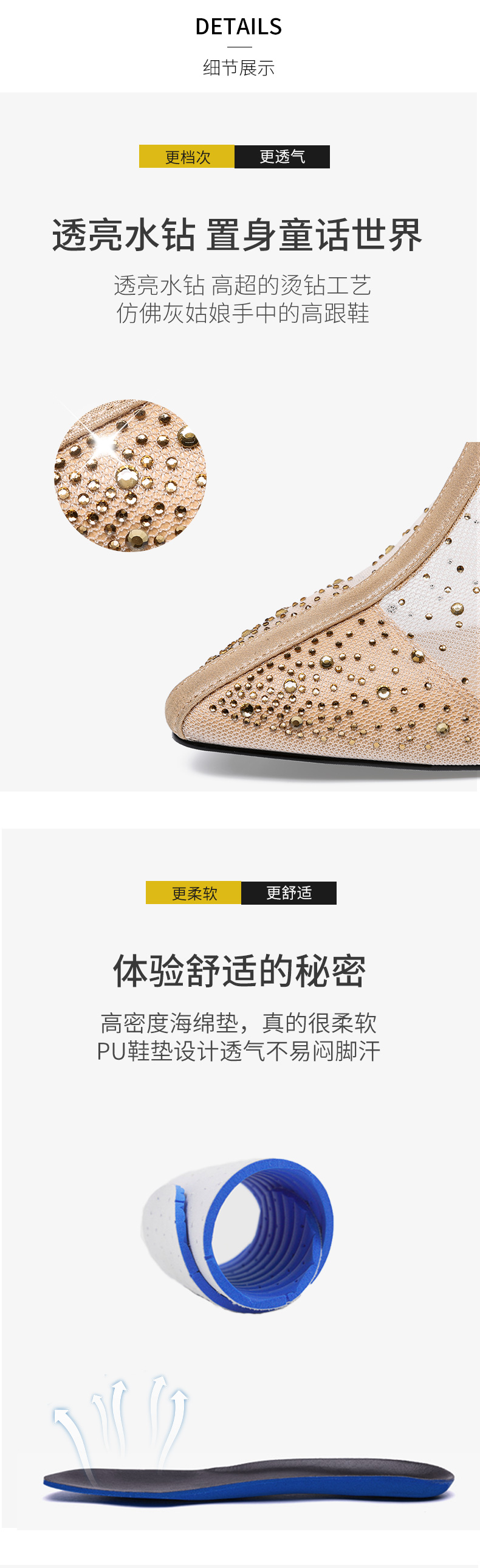 浪莎法式尖头高跟鞋女细跟2021春夏新款深口镂空网纱水钻休闲单鞋